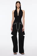 The Emelio Trouser blends cargo-inspired style with signature cowboy details. Made from bonded stretch fabric with vegan leather accents, it features a structured upper and a draped lower leg panel for added volume and graceful movement.