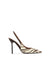 The Lidia Slingback 105 combines a pointed toe and slingback style in white and ebony printed cowhide, finished with a covered pin heel for a sleek, elegant look.