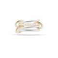 The Kira SG ring showcases a central band of channel-set baguette white diamonds totaling .55 carats, elegantly set in sterling silver and framed by 18k yellow gold bands. Connected by handcrafted 18k yellow gold links, each piece is meticulously made by artisans in Los Angeles, blending refined design with exceptional craftsmanship for a timeless statement of sophistication.