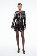 The Fifi Dress combines elegance with eye-catching allure. This long-sleeved sequin mini showcases a flattering natural waistline enhanced by thoughtful gathering details that create dimension and movement. The center front keyhole adds a refined touch of sophistication, offering a subtle peek of skin while maintaining an air of understated glamour. Perfect for evening events or upscale occasions where you want to make a memorable impression.