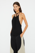 The Imber Metallic Halter Top combines silk noil and wool bonded knit with a subtle metallic sheen for a refined look. Its close-fitting silhouette features a high neckline, tie-back closure, and an open back detail, offering a sleek and elegant style. Perfectly pairs with the Imber Metallic Loop Skirt or tailored wide-leg pants for a polished ensemble.