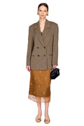 A sophisticated double-breasted blazer crafted from soft herringbone-textured fabric, showcasing impeccable tailoring with a sharp shoulder line and clean silhouette. Features welt pockets, a chest pocket, and refined sleeve seams for polished elegance. Perfect for elevating your professional wardrobe with timeless style and understated luxury.
