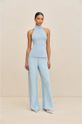 The Wake Top combines contemporary elegance with effortless versatility. This lightweight knit halter features a refined fold-over mock neck and striking open-back design, anchored by a wide back strap for secure, comfortable wear. The elastic back strap ensures a flattering fit that moves with you. Perfect for layering or wearing solo, this piece transitions seamlessly from day to evening with understated sophistication.