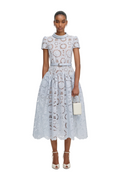 Ethereal elegance defines this blue floral lace midi dress, featuring a refined high neckline, coordinating belt, and gracefully scalloped hem. The fitted silhouette offers minimal stretch for a polished look, while practical details include a concealed back zip, removable cami lining, and detachable belt for versatile styling. Perfect for special occasions—pair with heels for an unforgettable impression.