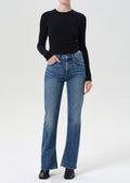 These Kick Boot Mid Rise Jeans offer a modern bootcut silhouette with a mid-rise waist that fits slim through the hips and gently flares at the hem. Made from comfort stretch regenerative cotton denim, they provide a soft feel and lasting comfort. The medium indigo wash features worn-in fading and whiskering for a vintage-inspired look. Perfectly paired with a slim knit or boxy tee, these jeans combine style and ease for everyday wear.
