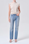 The Lana Jean features a relaxed straight silhouette with vintage-inspired proportions and a structured top block. Its medium indigo wash with subtle creasing delivers an authentically lived-in look. Made from 100% regenerative cotton denim with a soft hand feel, this essential piece balances effortless charm with refined elegance and everyday comfort.