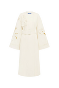 This Celestine Applique Wool Blend Coat features a premium double-sided white wool blend with a straight-cut silhouette for timeless elegance. Hand-stitched edges and cuffed sleeves add refined detail, while metallic snap buttons provide subtle shine. Laser cut-out embroidered florals enhance its sophisticated look. A detachable matching belt tie allows for a customizable fit, combining style and comfort effortlessly.