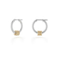 Ghost image of a pair of Spinelli Kilcollin Ara earrings that feature a mini sterling silver hoop adorned by three 18k yellow gold annulets, with the foremost one pave with white diamonds.