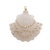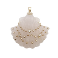 Hand-carved rose quartz shell pendant set with three white sapphires and gold balls. Features a gold backing with heart detail and bail. 2" x 2". A refined blend of natural stone and precious accents.