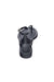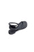Black leather flat sandal with a refined hoop detail and adjustable ankle buckle. Versatile enough for day or evening wear, with a comfortable flat sole and secure fit.