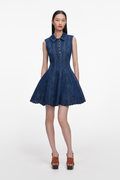 Romantic charm meets street-wise denim in this mini dress, featuring delicate broderie anglaise detailing on a scalloped skater-style skirt. The button closure at back, functional pockets, and fabric stretch ensure both comfort and practicality. Style with flats for a festival-ready look or elevate with heels for evening sophistication.