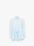 The Peplum Drape Shirt features a boxy fit with a distinctive patchwork construction and a layered drape hem for added dimension. Designed with dropped shoulders and a back pleat, it is accented by yellow crockery embroidery on the chest and a yellow circular anchor embroidery at the hem, combining sophisticated details with modern style.